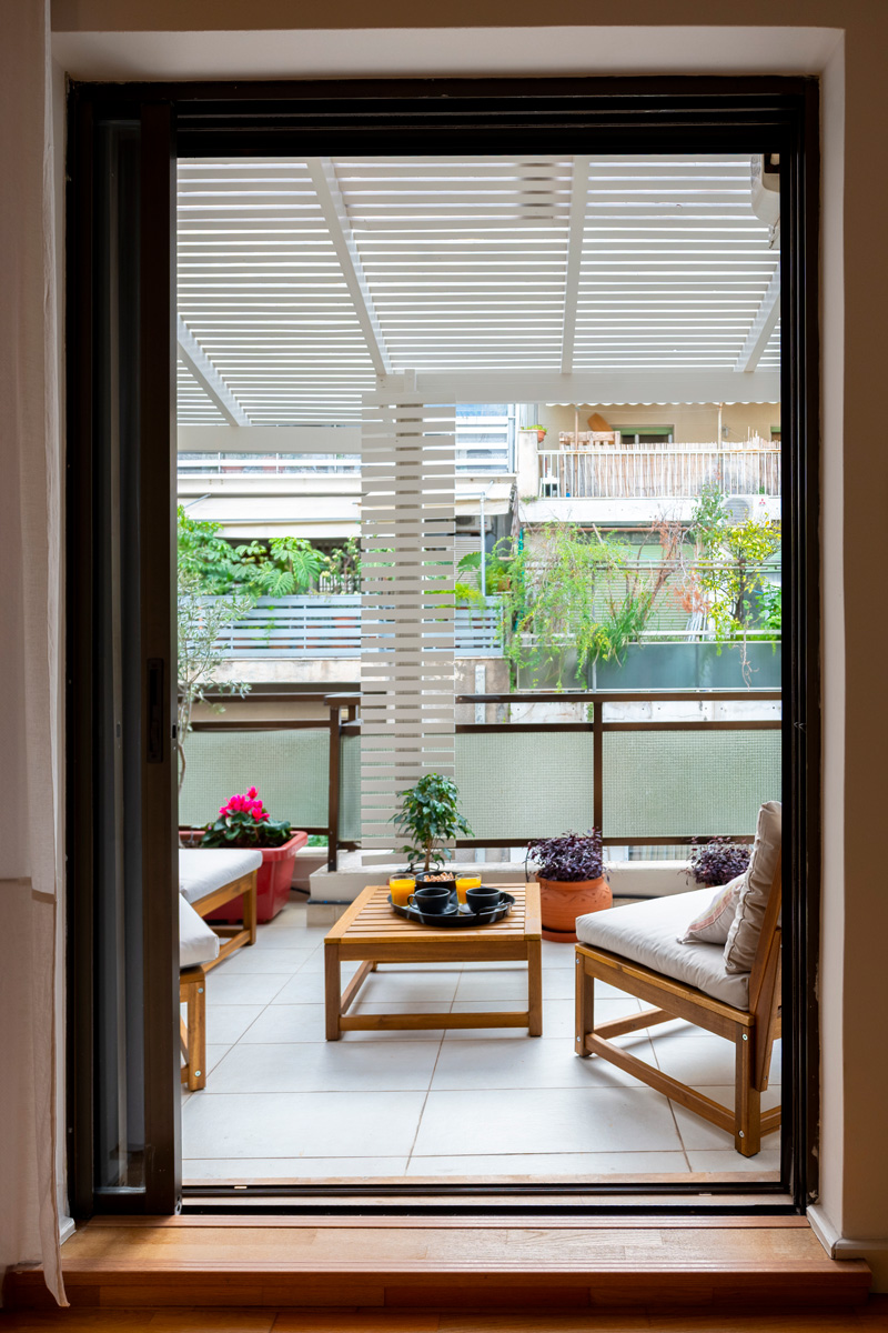 The sleeping area includes a comfortable double bed and a spacious wardrobe, offering plenty of storage and a relaxing space to unwind. The fully equipped kitchen is modern and functional, complete with quality appliances, a dishwasher, and everything needed for home-cooked meals. The stylish bathroom includes a washing machine for added convenience. A true highlight of the apartment is the private 15 sq.m. terrace, beautifully decorated with lush plants and comfortable outdoor seating. This peaceful outdoor space is perfect for enjoying your morning coffee, a glass of wine in the evening, or simply relaxing under the Athenian sky.